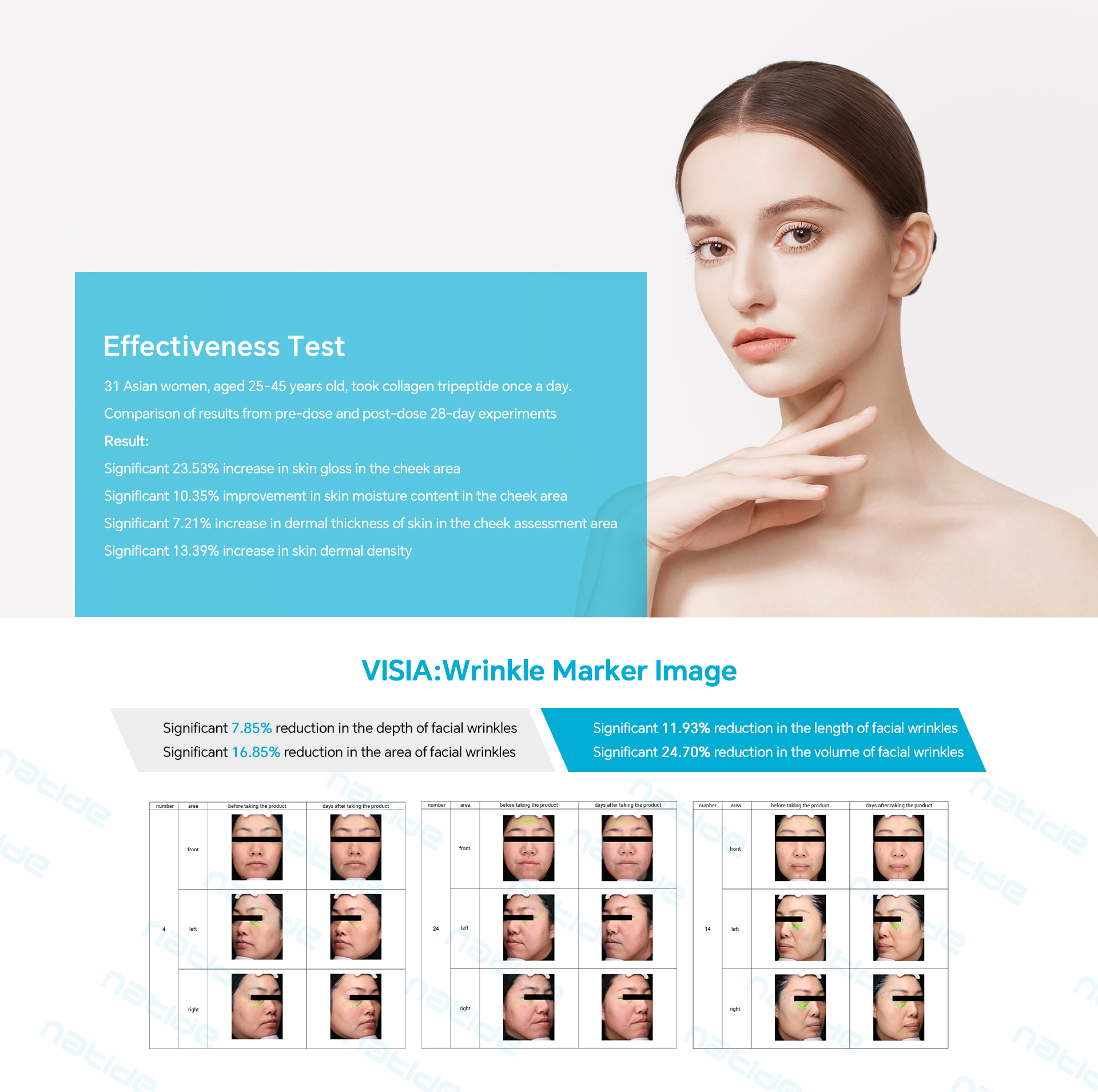 The company collaborated with well-known third-party institution to conduct human clinical experiments and verified that the product has a significant improvement effect in: skin gloss, skin moisture content, skin elasticity, skin firmness, etc.
